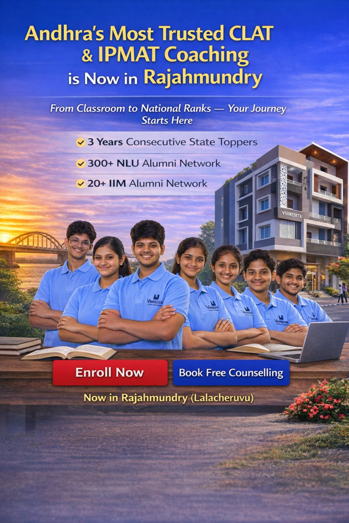 VSHRESHTA’s expansion to Rajahmundry carries forward the same academic discipline, integrated preparation model, and student-first mentoring system that shaped its reputation in Vizag. With this new campus, students in Rajahmundry can now experience a proven path for Intermediate + CLAT, IPMAT, and IAS Foundation coaching under a brand that has already created strong trust through performance and consistency.